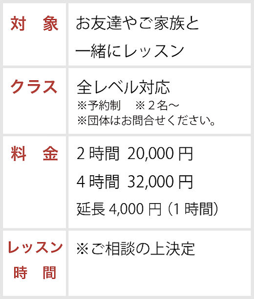 各クラスに分かれ、1回2時間のレッスンを行います。